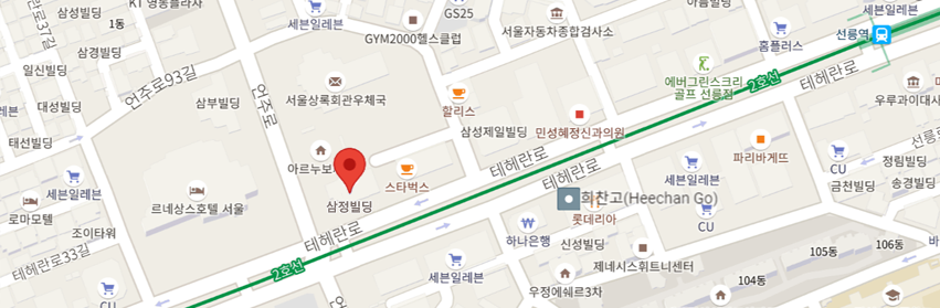 | Address | (06152) 서울특별시 강남구 테헤란로 301 삼정빌딩 7층 / 7F. Samjoung B/D. 301, Teheran-ro, Gangnam-gu, Seoul, Korea | ||